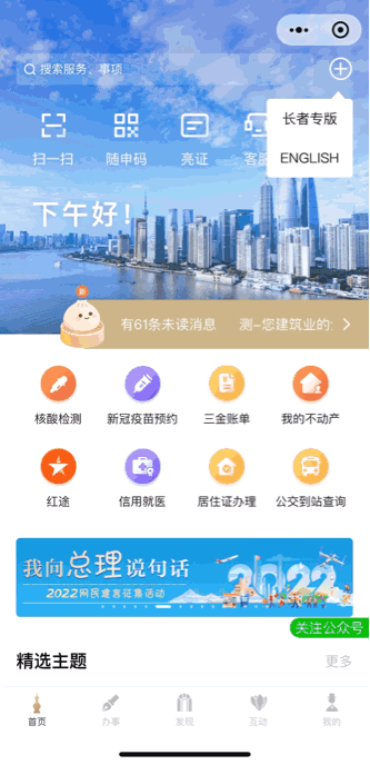 1、打开“随申办”微信小程序、“随申办”APP、“随申办”支付宝小程序,首页点击右上角“+”选择“长者专版”。