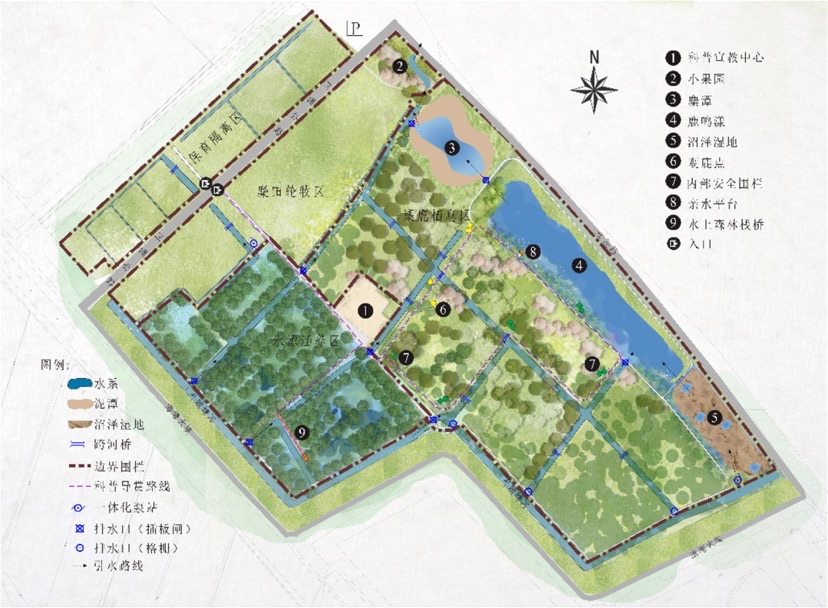 整个项目占地300多亩,被划分为麋鹿栖息区、麋田(轮牧)区、隔离区、水源涵养区和科普宣教区5大功能区。麋鹿栖息区除了有麋鹿喜爱的泥潭环境、生态湿地景观、芦苇滩等,在满足麋鹿栖息环境的同时,还营造了具有自然野趣的沼泽湿地景观,并起到水质净化的作用。