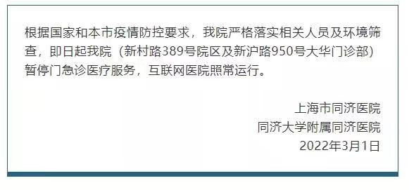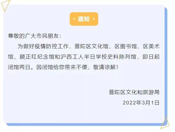 大家注意啦!普陀区文化馆、区图书馆等文化场馆即日起暂停开放,上海市同济医院即日起暂停门诊医疗服务,具体详情请往下看。