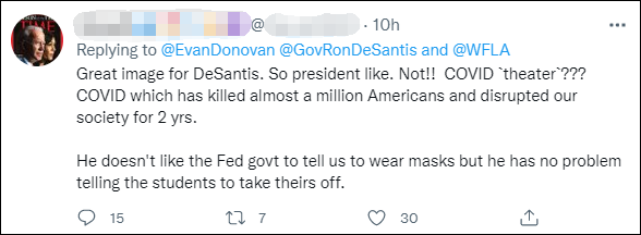 “这就是德桑蒂斯的好形象。如此像一名总统。并不!新冠‘骗局’?疫情导致近100万美国人死亡,并扰乱了我们的社会长达2年。他不喜欢联邦政府让我们戴上口罩就算了,但他却能毫不客气地让学生们摘下口罩。”