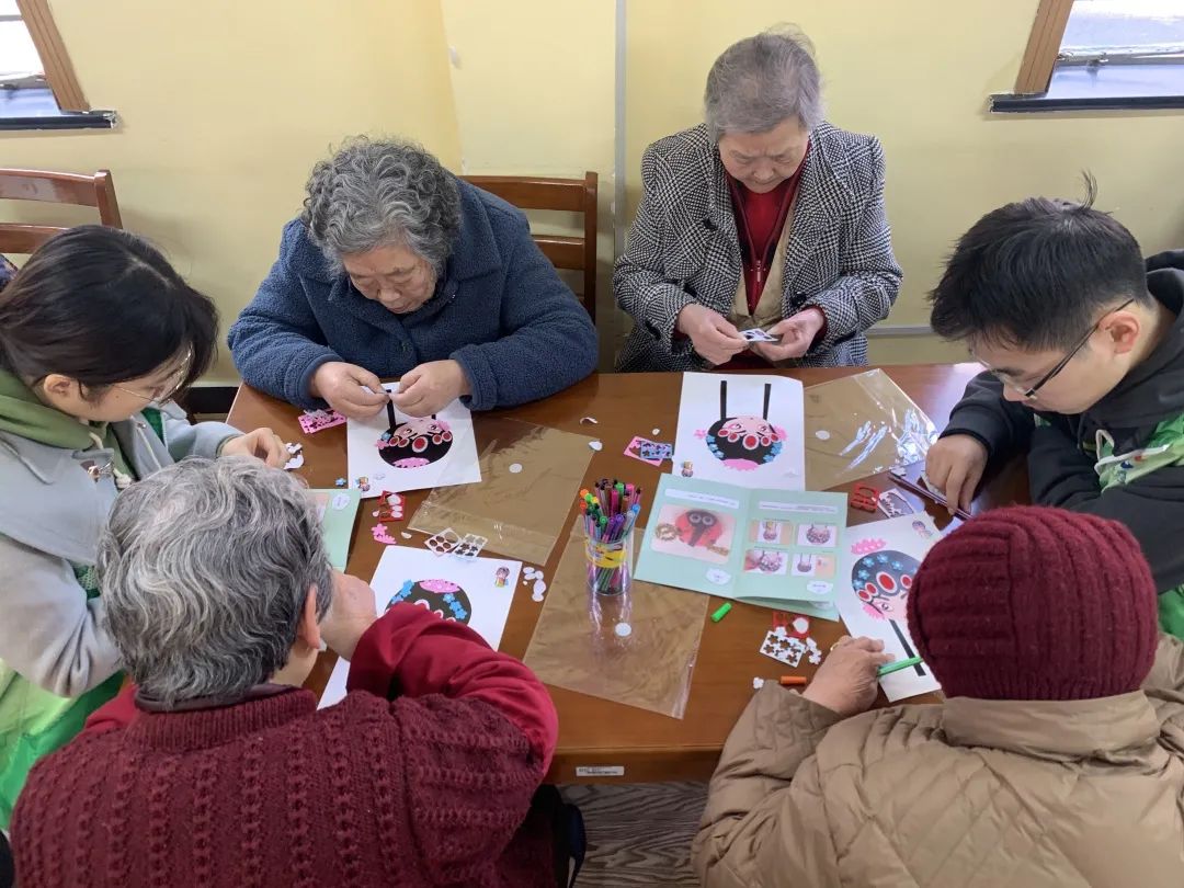 在四平路街道老年人日间服务中心里,来自同济大学新生院同舟学堂的大一学生们正与爷爷奶奶围坐在桌边,为面前的一张张彩色拼贴画忙碌着。