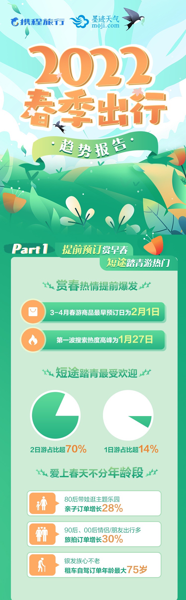 出行人群方面,报告显示,80后占比近三成,90后、00后占比近六成。各个年龄段的用户也都有自己钟情的赏春玩法。90后和00后中,朋友、情侣出行占据相当大比例,少不了拍美照发个朋友圈,携程平台上,来自他们的旅拍订单同比增长约三成。80后最爱带娃去的地方就是主题乐园,门票预订量同比去年增长28%。而对于越来越多心态年轻、有钱有闲的银发一族来说,自驾出游满足了他们自由把握出游节奏,不用匆忙打卡的需求,在携程租车自驾春游的用户中,年龄最大的有75岁,正是享受自在的好年纪。