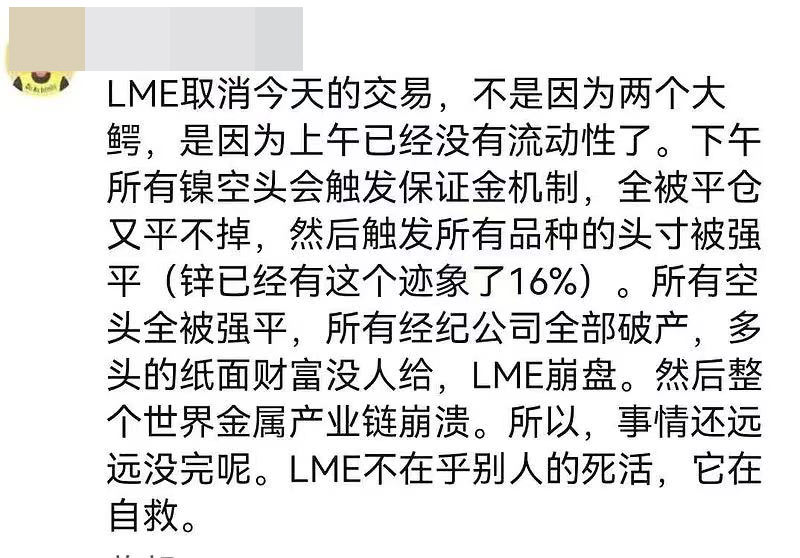 LME取消今天的交易,不是因为两个大鳄,是因为上午已经没有流动性了。下午所有镍空头会触发保证金机制,全被平仓又平不掉,然后触发所有品种的头寸被强平(锌已经有这个迹象了16%)。所有空头全被强平,所有经纪公司全部破产,多头的纸面财富没人给,LME崩盘。然后整个世界金属产业链崩溃。所以,事情还远远没完呢。LME不在乎别人的死活,它在自救。