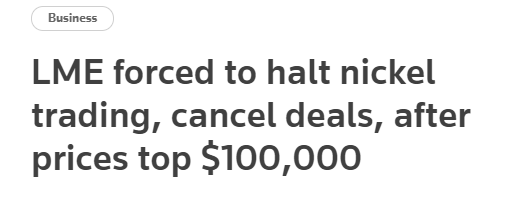 正在镍价疯涨让市场“目瞪口呆”之际,LME在北京时间周二晚间紧急宣布,暂停镍交易,且预计在3月11日也就是本周五前,不会重启镍交易。