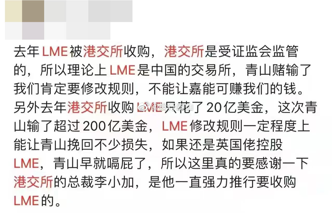 目前LME虽然在伦敦,但在10年前就已被港交所收购。因此市场也有观点认为LME“拔网线”的举动,是在保护传闻中被“逼空”的中企青山控股免遭更大损失。