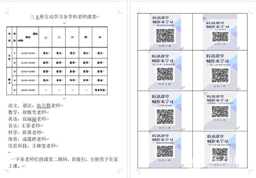 于是,段老师将线上教学需要的设备和操作方式做了精细化指导,并将课表和各科教师的课堂二维码详细的罗列,以便小博能够顺利地跟着空中课堂和课表上显示的腾讯课堂进行学习。经过反复指导和操练,小博能够自己通过家里的电视和手机完成在线测试。