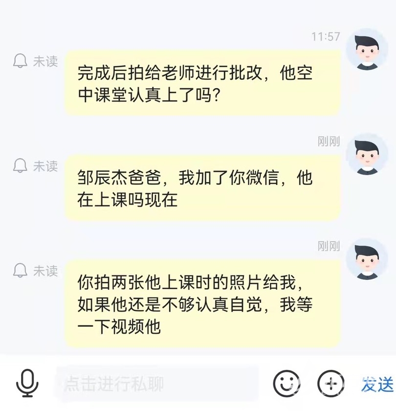 今天英语课后,步老师还通过微信对小杰进行英语学科的个别辅导,这也增加了小杰对线上学习的自信。