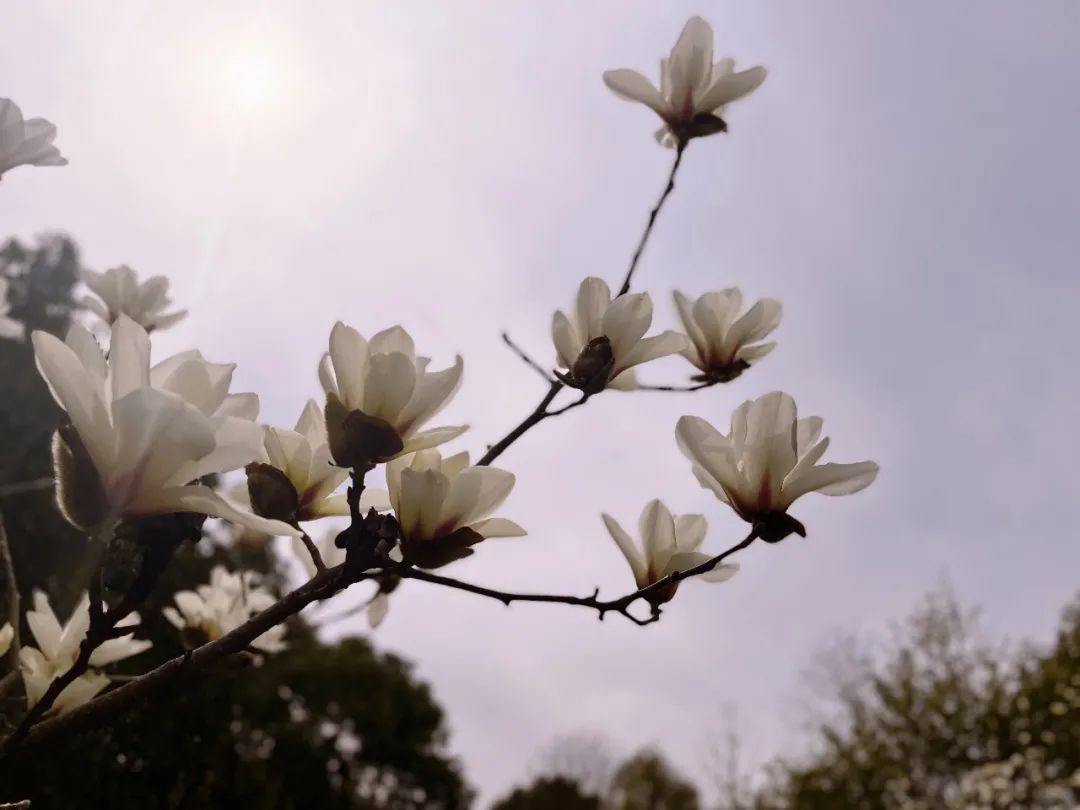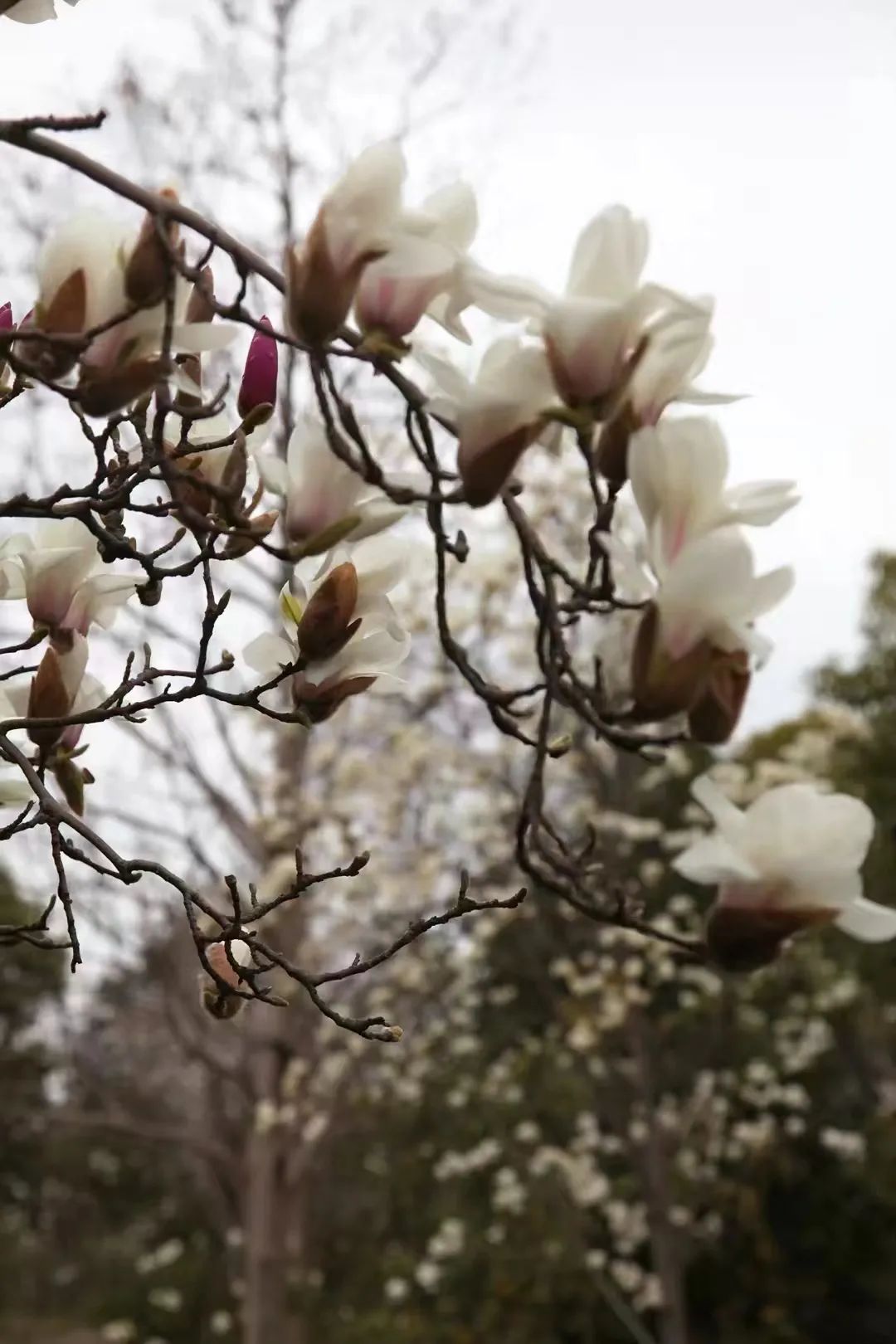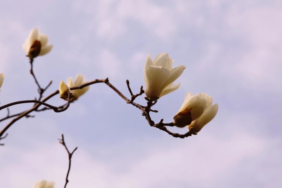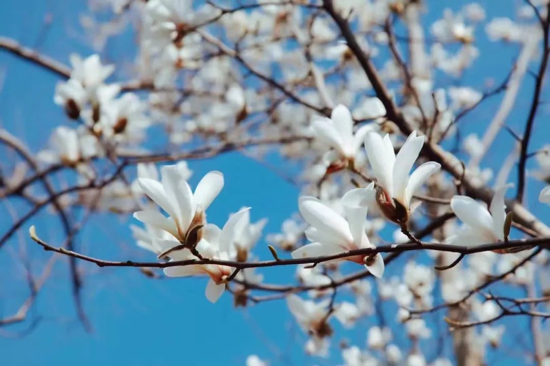 一株株干净利落的秃枝上,白玉兰傲然花开,无叶无绿洁白无瑕,一朵朵迎面向上。