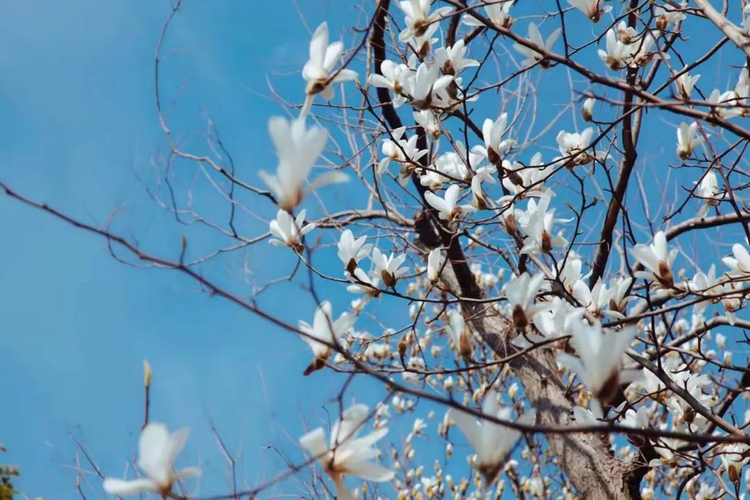 湛蓝的天空下,玉兰花亭亭玉立,优雅而款款大方。