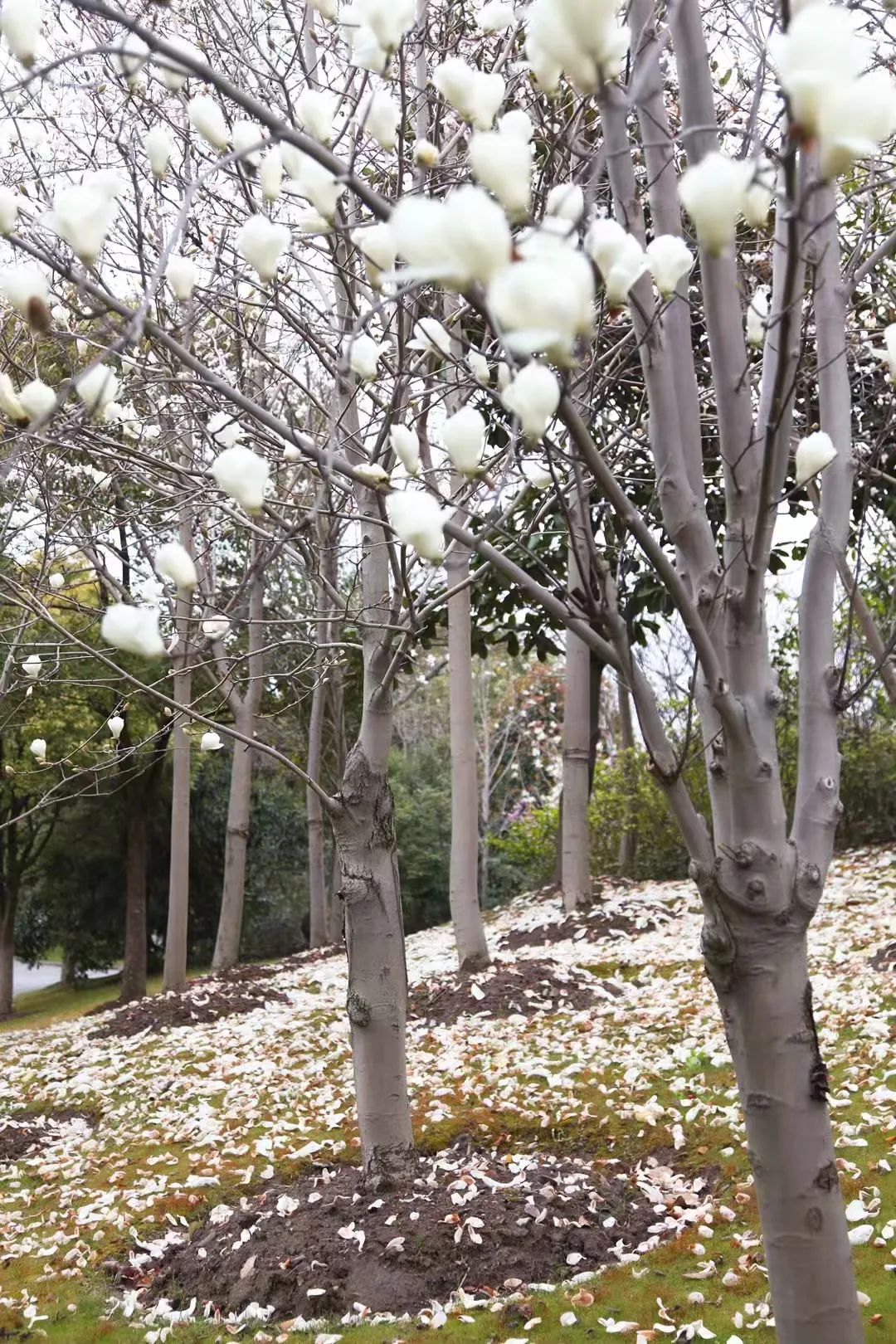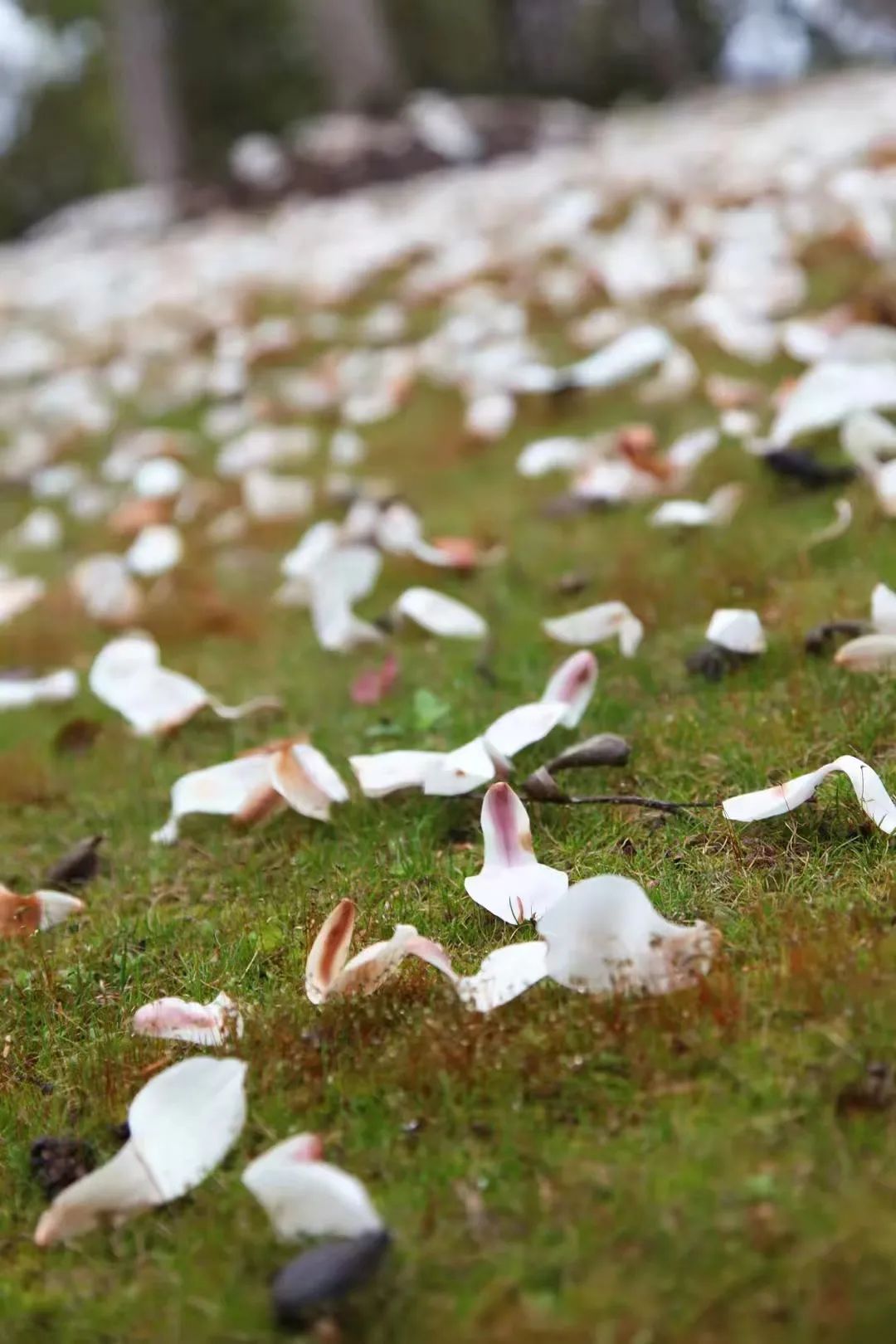 如李渔所说:“一树好花,止须一宿微雨,尽皆变色,又觉腐烂可憎。”玉兰很轴,花开全盛,一夜春雨,整树花一齐凋零,片瓣不留。