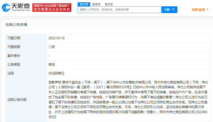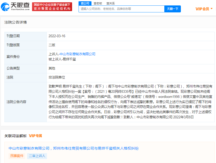 天眼查App显示,近日,法院刊登郑州市伟仕商贸有限公司、中山市彩意制衣有限公司致歉公告,两公司分别向易烊千玺致歉。