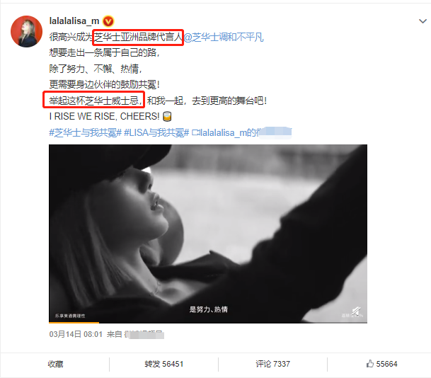 据悉,作为泰国籍的Lisa在3月14日官宣成为某威士忌品牌宣传大使。在此期间,Lisa拍摄品牌广告并参加了其宣传活动,相关视频在社交平台传播。