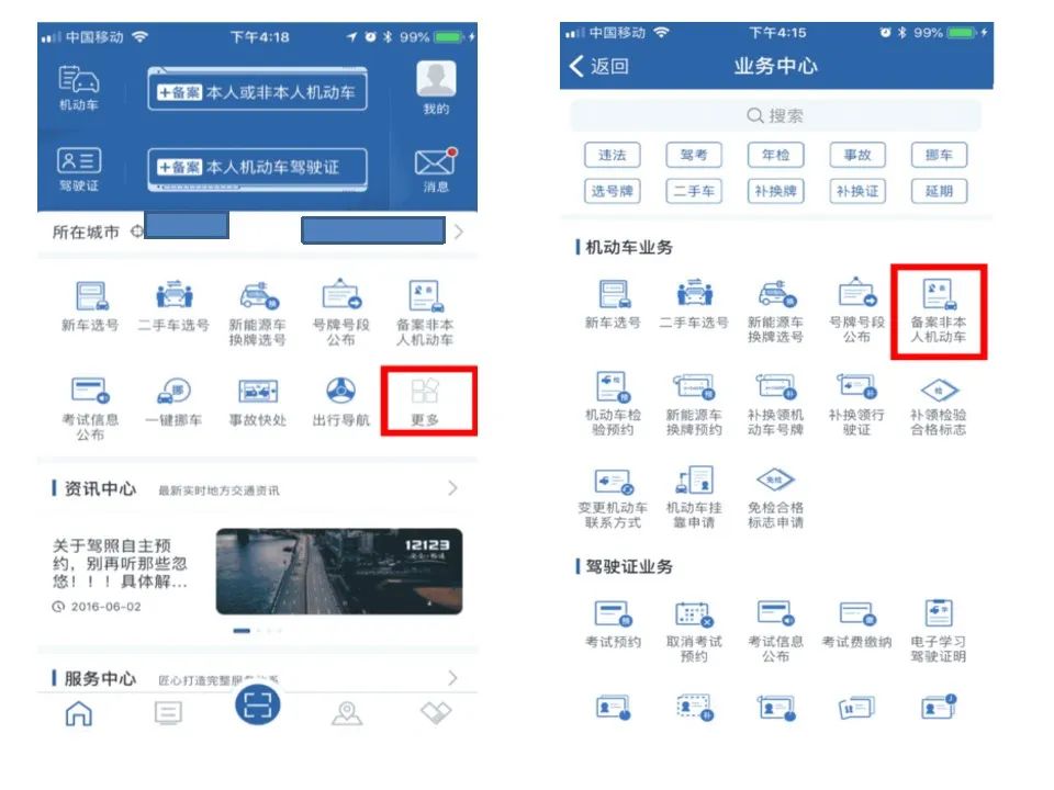 登录“交管12123”APP后点击“更多”进入“业务中心”,在“业务中心”中点击“备案非本人机动车”。