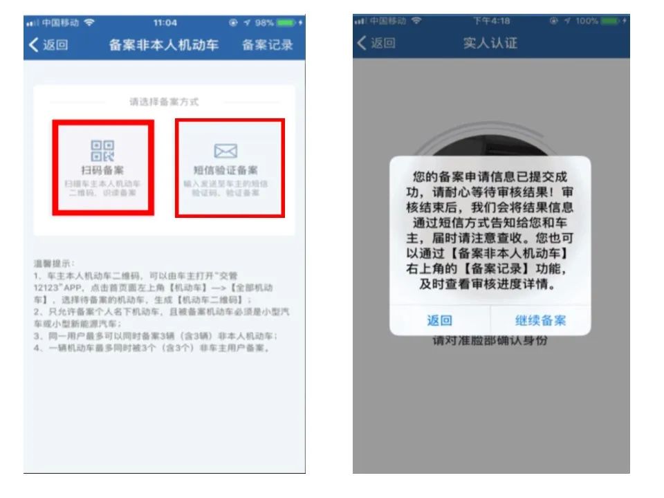 进入“备案非本人机动车”业务流程后,用户可以选择“扫码备案”或“短信验证备案”两种方式备案非本人机动车。按照提示操作后,对于已启用公安部可信身份认证的,用户进行“实人认证”,“实人认证”通过的,备案申请提交成功。