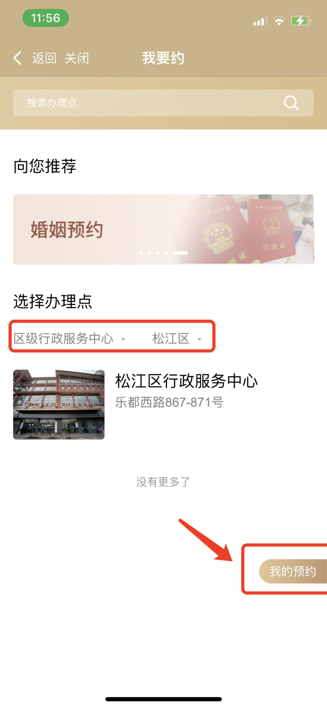 在“松江区旗舰店”界面找到“我要约”,点击进入,选择“松江区行政服务中心”办理点,对具体事项进行预约(预约需提前一日完成),预约结果可以在“我的预约”中查看。
