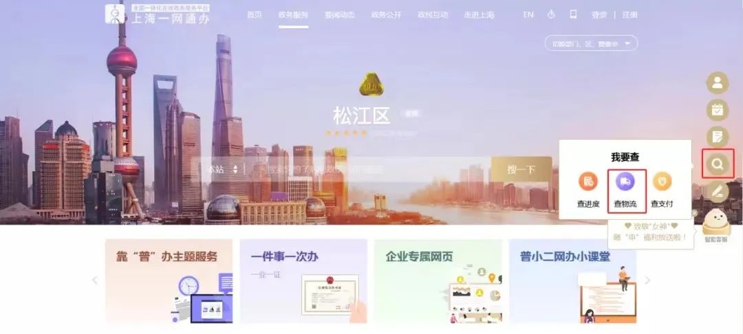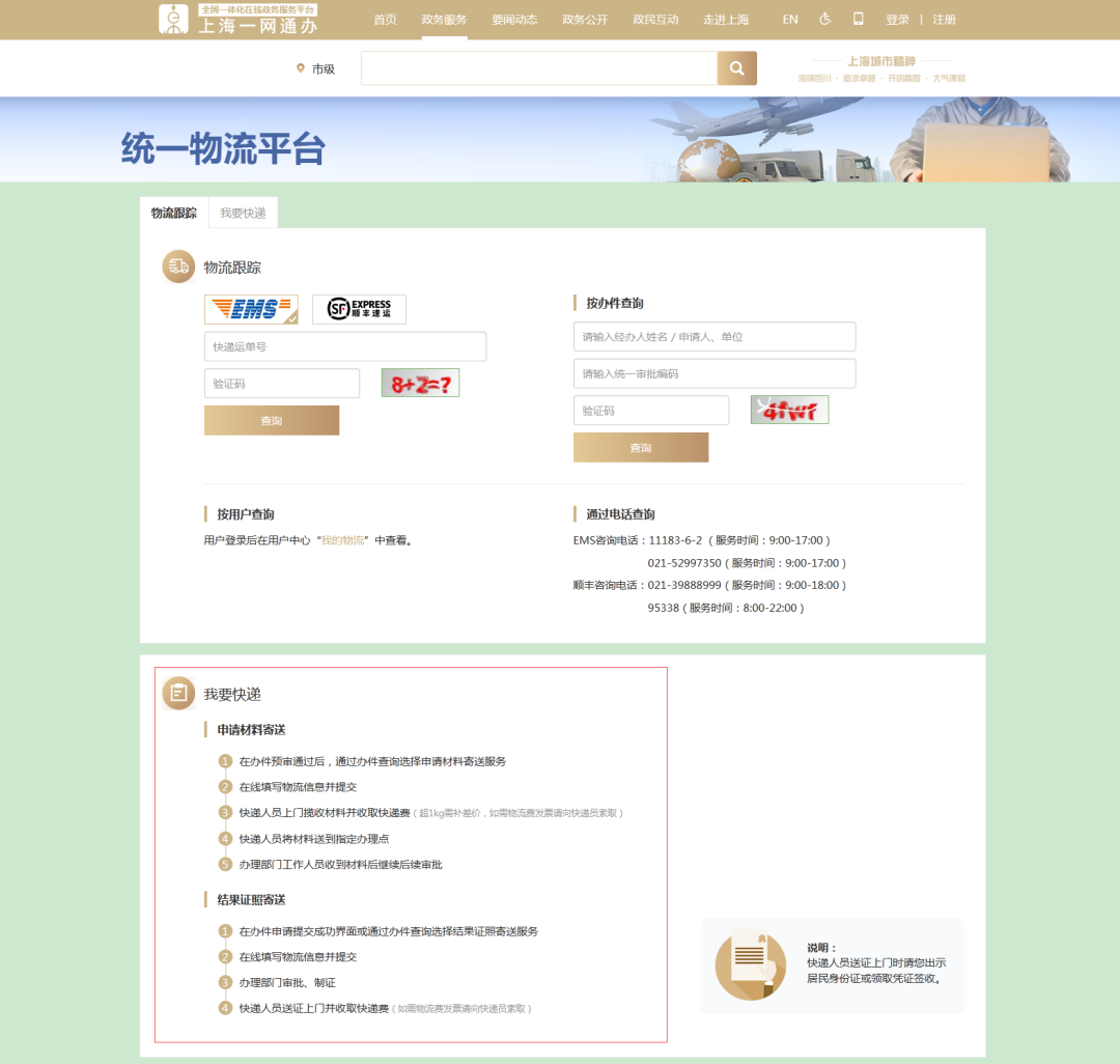 市一网通办网页下单:在线预审通过后或办件提交后,可至“一网通办”统一物流平台的办件查询,选择寄递服务。点击右侧“放大镜”,点击“查物流”,进入统一物流平台。