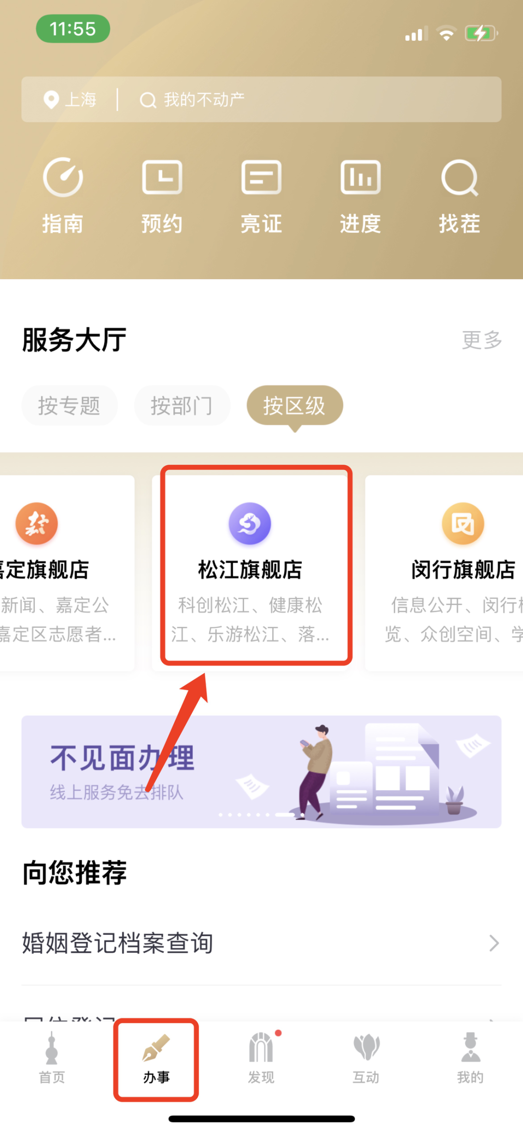 预约渠道:进入“随申办”市民云App,点击下方“办事”,进入“办事”频道,在“服务大厅”中从“按区级”里,找到“松江区旗舰店”,点击进入并关注。