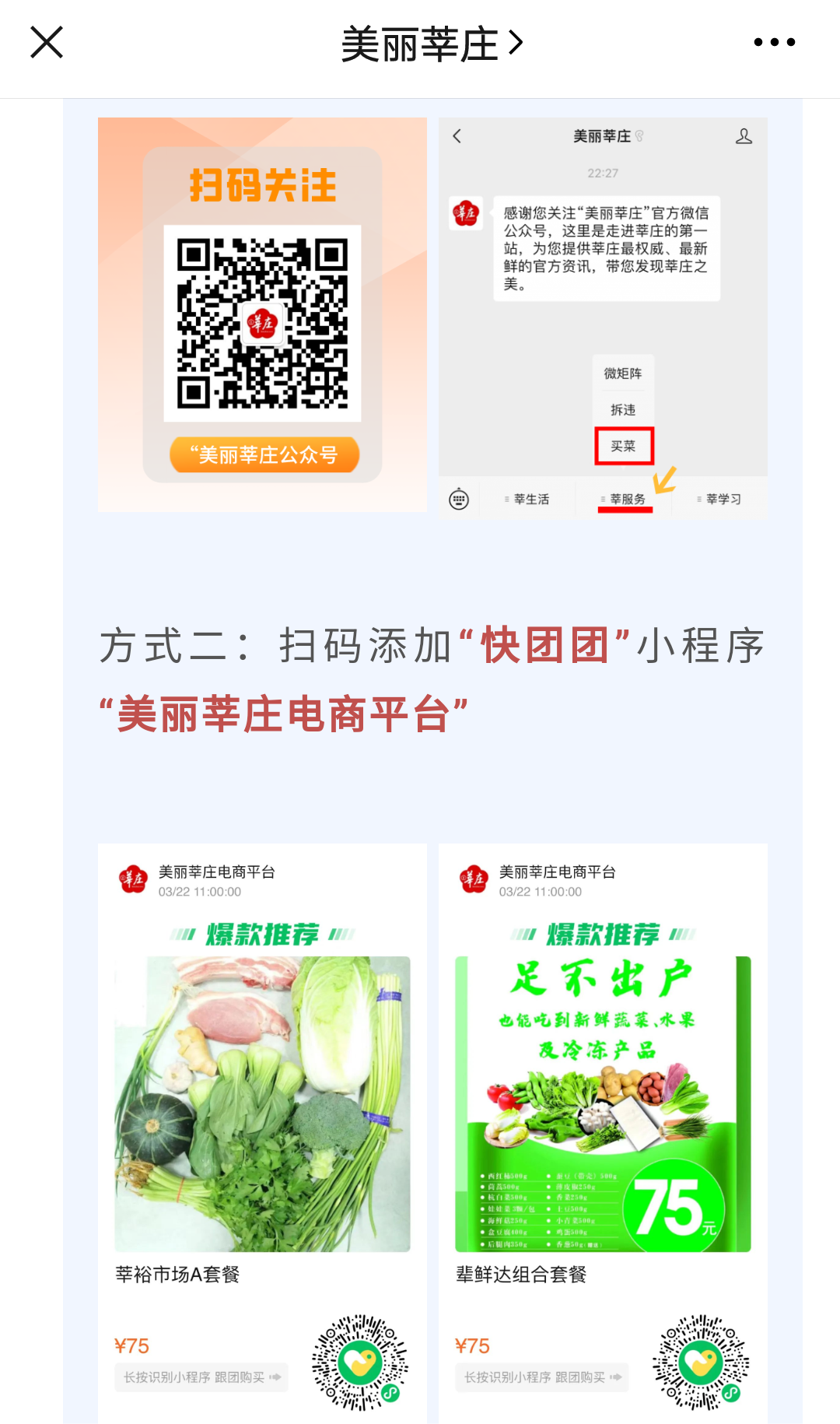 马先生跟团的就是莘庄镇3月22日推出的“快团团”线上接单小程序。据介绍,该团购每日下午2 点统一截单。通过“美丽莘庄”微信公众号“莘服务”菜单栏点击“买菜”下单付款,一般次日送货至小区门口指定位置,由居委通知后自取(封控楼栋由小区志愿者提供上门服务)。此外,莘庄镇还联合辖区三大超市推出各类蔬菜和肉制品套餐,按片区形式保障全镇居民日常生活需求。居委安排志愿者做好需求收集,并与指定超市对接。各大超市根据各自配送能力,在1-2天内完成配送。