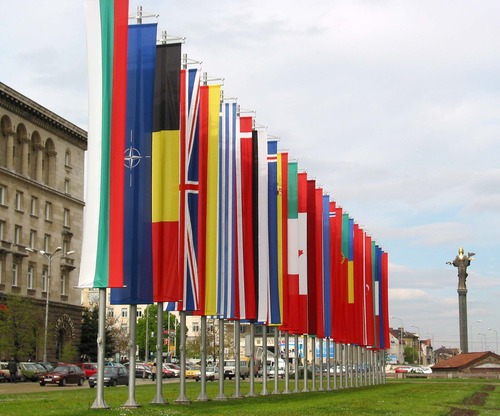 2004年4月22日,北约会旗和26个北约成员国国旗并排悬挂在装饰一新的保加利亚首都索非亚市中心广场上。新华社记者郭爽摄