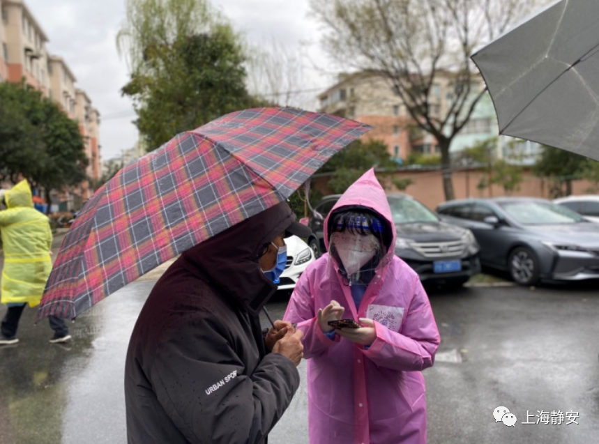 彭博业主委员会事务所工作人员报名参加居民区核酸检测志愿工作,在风雨中坚持服务6个多小时,为有需要的居民完成“健康云”核酸检测登记,维持检测秩序。