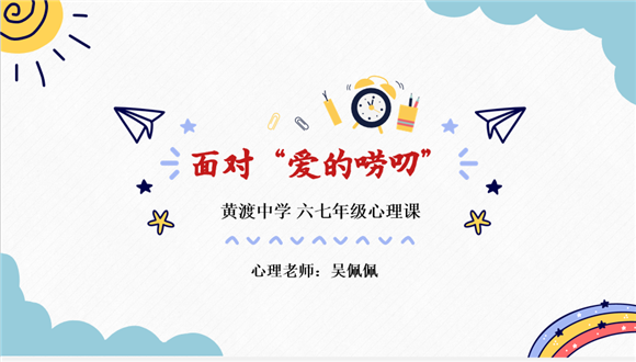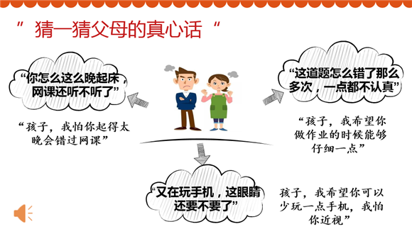 居家学习,亲子关系相处地如何呢?学校收到了不少学生和家长的反馈,很多同学在家期间受不了父母的唠叨而产生逆反心理,家长们明知唠叨无用却也不知如何沟通,黄渡中学吴佩佩老师在心理课上尝试让学生们静下心来思考父母唠叨背后的含义,学会直面“唠叨”的妙方。
