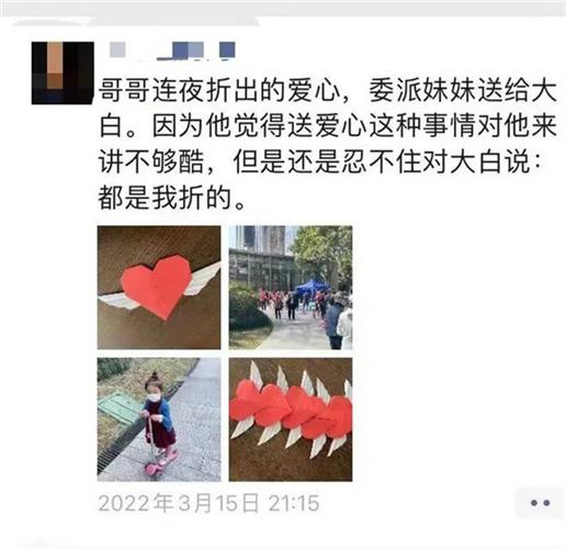 三年级的福娃陈歆沂看到了做核酸的工作人员们非常辛苦,回到家中把自己的所见所闻用画笔记录下来;四年级的福娃陈号钦是个可爱的大男孩,他发挥自己的动手能力用彩纸折了许多爱心,和妹妹一起在做核酸时间送给了辛勤工作的大白们;三年级的双胞胎兄弟史隽平和史隽安也自发地翻出家里的一些生活用品,自高奋勇地去送给了无法回家的物业工作人员……