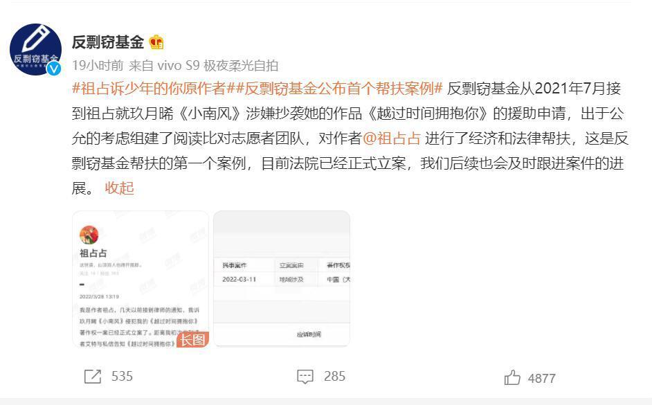 3月28日,反剽窃基金会官方发声支持祖占:“反剽窃基金从2021年7月接到祖占就玖月晞《小南风》涉嫌抄袭她的作品《越过时间拥抱你》的援助申请,出于公允的考虑组建了阅读比对志愿者团队,对作者 @祖占占 进行了经济和法律帮扶。这是反剽窃基金帮扶的第一个案例,目前法院已经正式立案,后续也会及时跟进案件的进展。”
