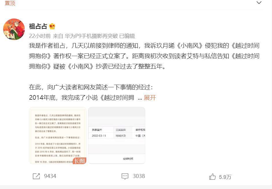 3月28日,网文作者祖占发文,讲述了她这几年来的心路历程。简单来说,她2015年写的文章《越过时间拥抱你》先是在网络上连载,同年完结出版。2016年2月收到网友私信,得知另一个网文作者玖月晞的《小南风》和她的作品内容高度类似。当时她虽然知道自己的权益受到了侵害,但没有办法做出改变。如今,在反剽窃基金会的帮助下,终于能够成功起诉玖月晞。