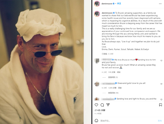 声明中称:“经过慎重考虑,布鲁斯决定离开这个对他来说意义重大的职业生涯,同时这对家庭来说是一个非常具有挑战性的时刻,感谢大家的关心和支持。”