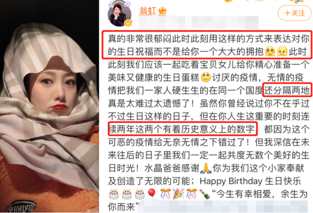 翁虹还说到本该吃着宝贝女儿给准备的生日蛋糕,却因为疫情而被分隔两地实在是太遗憾,但她深信未来的日子一定会度过无数美好的时光。