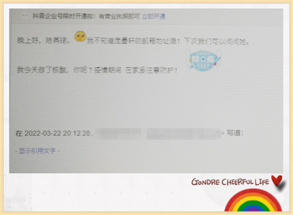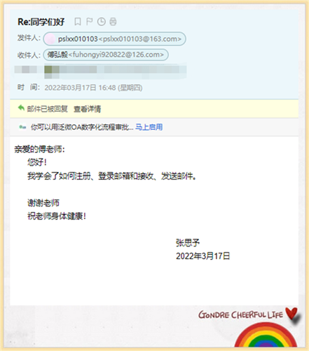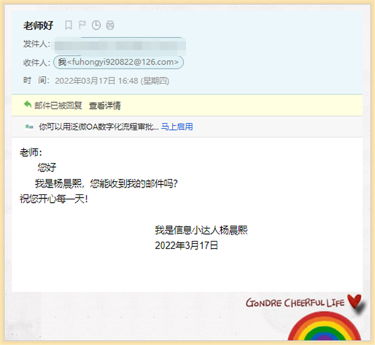 同学们,我们已经居家线上学习有一段时间了,你是否想念老师和自己的小伙伴?是否想和他们联系一下呢?我们在信息科技课“邮箱”单元的学习中,已经学会了发送电子邮件的方法,那就让我们一起来学以致用吧!请你尝试一下与老师或者自己的小伙伴们互相发送一封电子邮件,传达你的问候好吗?