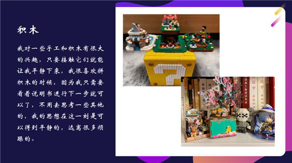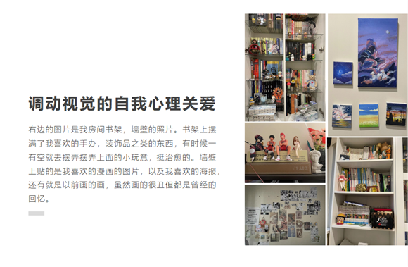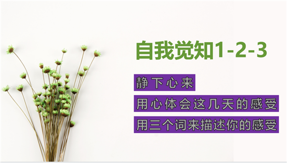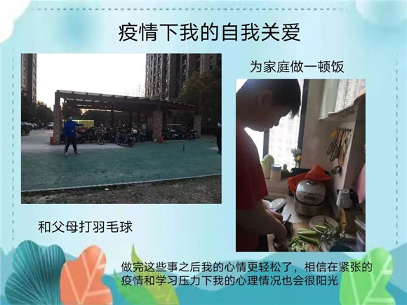 一周后,学生们纷纷提交了自己的自我关爱方式。有调动嗅觉的、有调动视觉的、有调动触觉的、有调动味觉和动觉的等等。学生们表示,采用了这些方式后,自己的心理放松了不少,也对自己在疫情线上学习的压力下能保持自己的心理健康更有信心了。