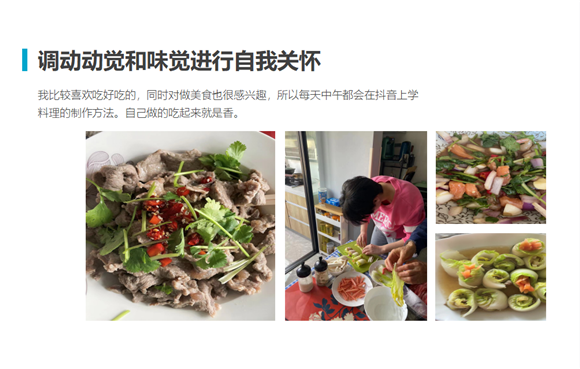 比如,心理老师首先向同学们讲述了我们可以利用、以及如何利用感官调动来进行自我心理关爱。随后布置了课后小任务:“请每位同学选取1-3种调动感官的方式来进行自我关爱,并以图片和文字相结合的形式,制作成PPT,与大家进行分享。”