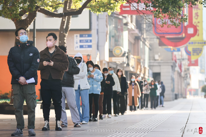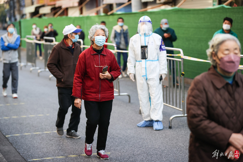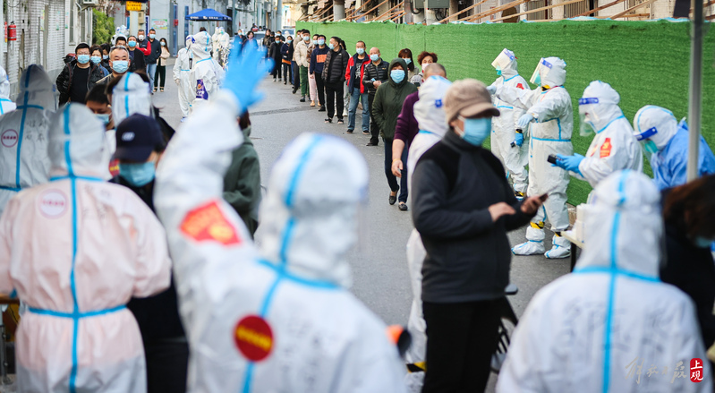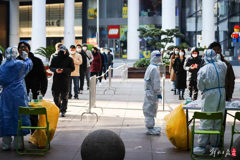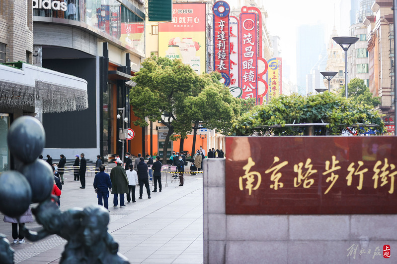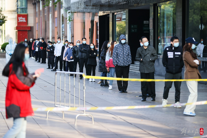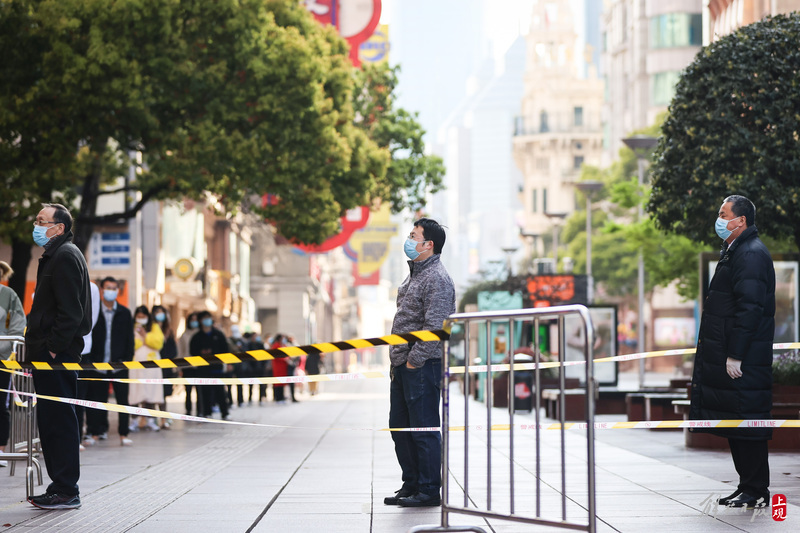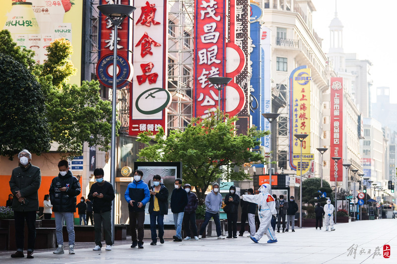 今晨上海全市范围开展核酸检测,南京路步行街采样现场有序排队