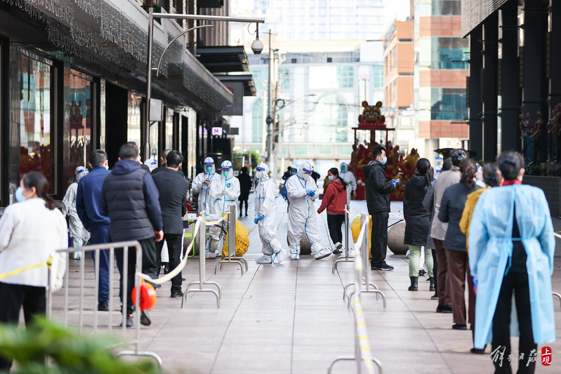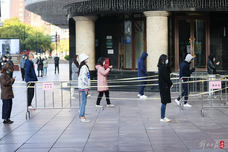 南京路步行街周边商户、写字楼以及酒店的工作人员和住客有序排队做核酸。