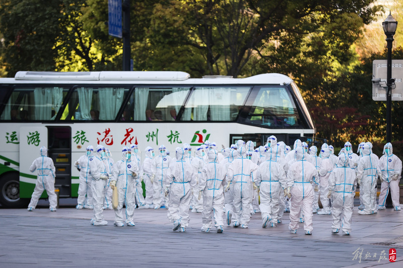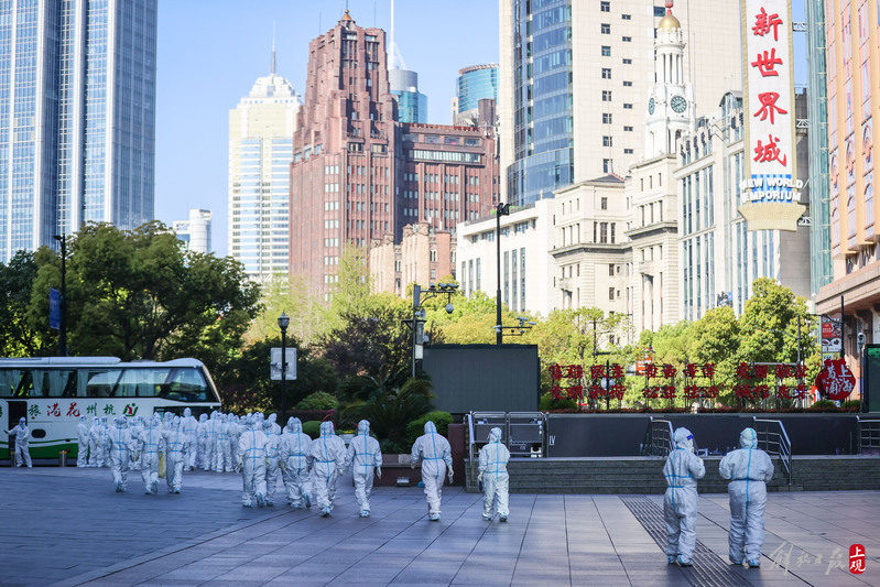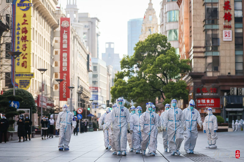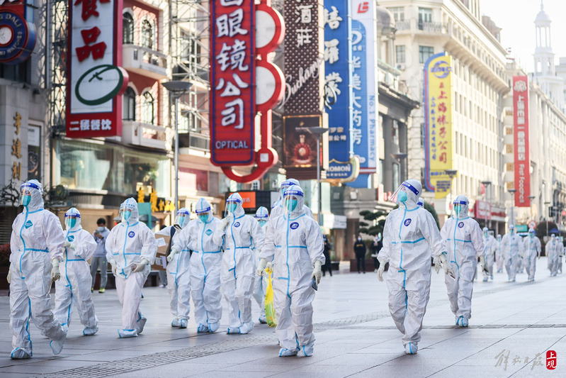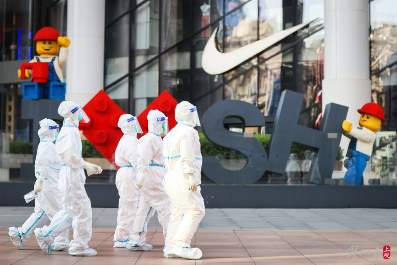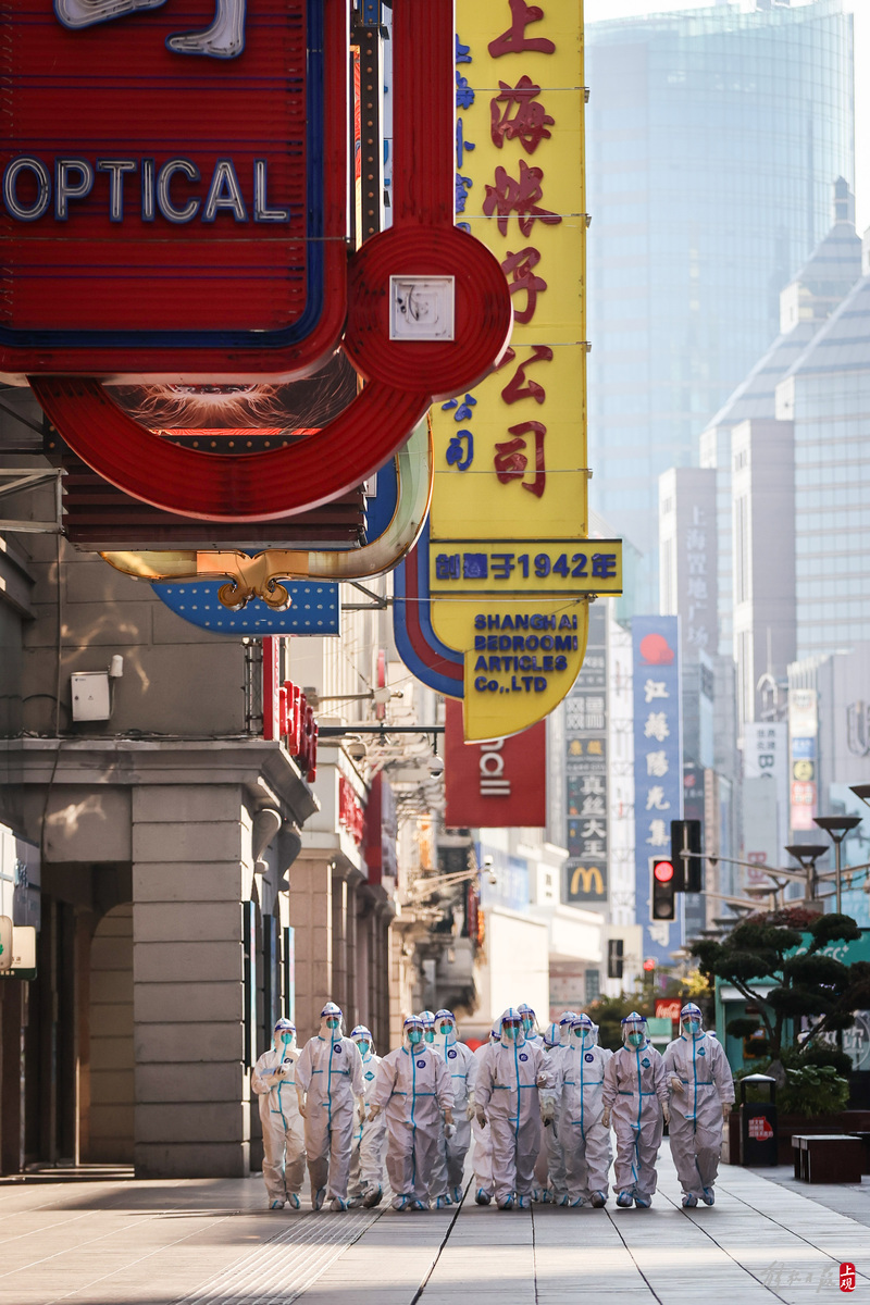 一批来自浙江温州的援护医务队员,清晨途径南京路步行街,计划前往采样点进行核酸采样工作。