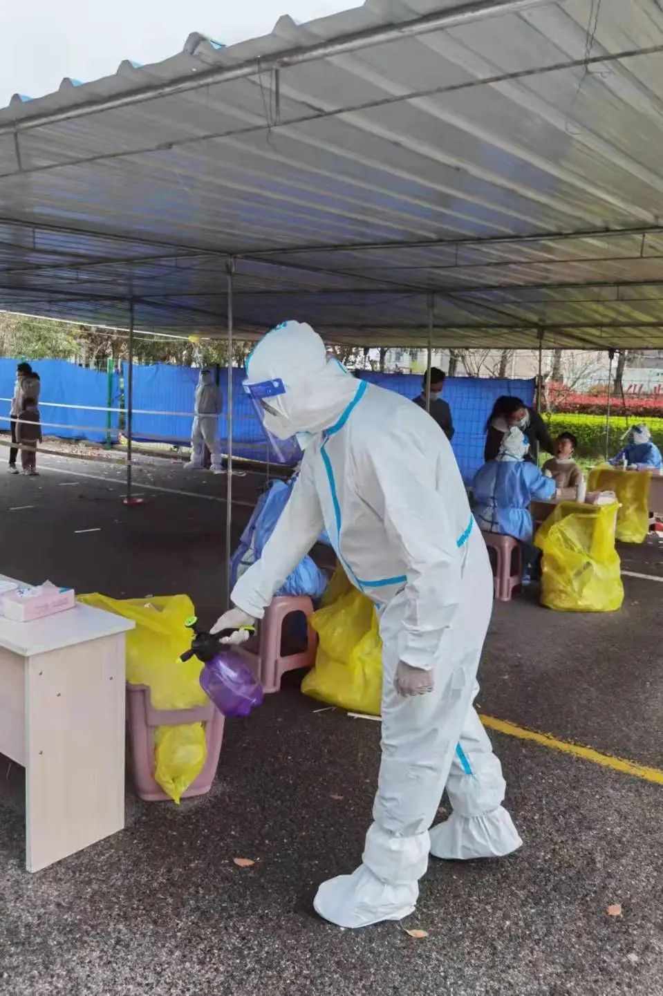 时间紧、任务重,突击队员们刚抵达四团镇政府,还没来得及照一张集体合照就按当地政府安排迅速散开,分为6组化身“大白”前往各自战斗点位开展抗疫工作。