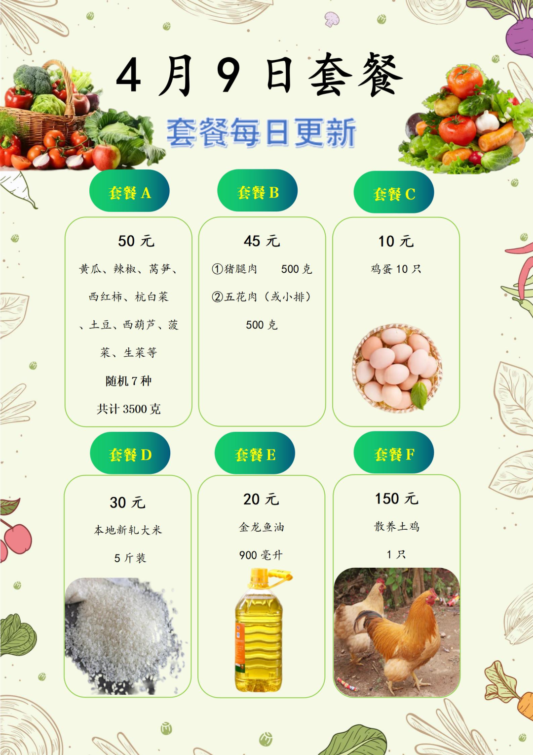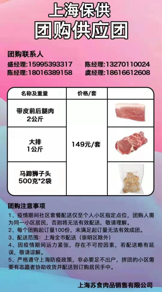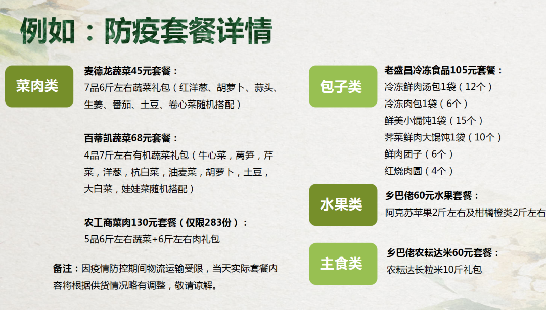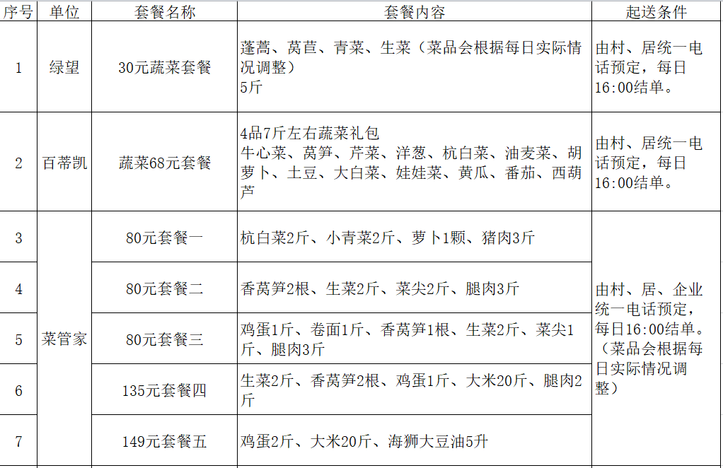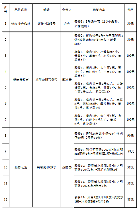 由于防疫期间运输受限,套餐内容将提前2-3天向村、居委、行业主管单位公布,套餐每日更新,每日更新信息请关注“安亭观微”微信公众号。