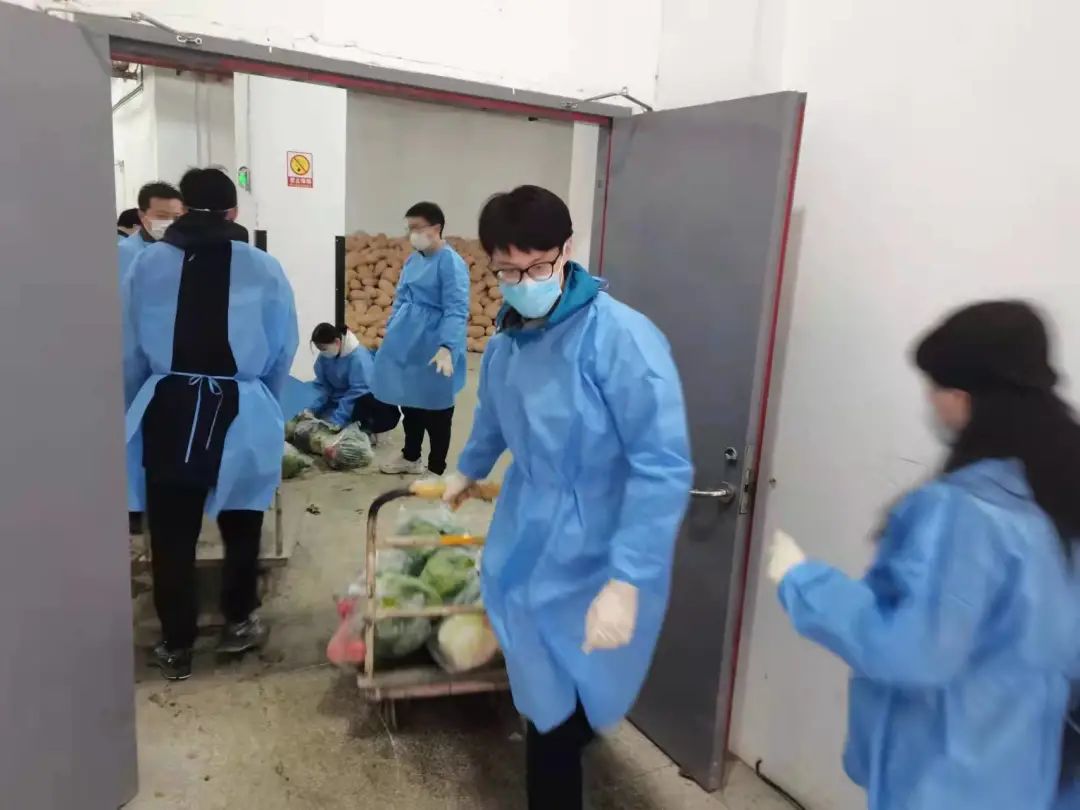 蔬菜包从地下一层的冷库转运至地面,大家继续用推车、双手接力搬运装车,“大白”下已是大汗淋漓。随后志愿者们又转战冷库继续出库,工作环境反复“切换”:“一进冷库,之前一身汗感觉黏在衣服上结了层霜,冰冰冷的。”当天下午,夜班组又接过白班组的接力棒,一直忙碌到深夜12点。