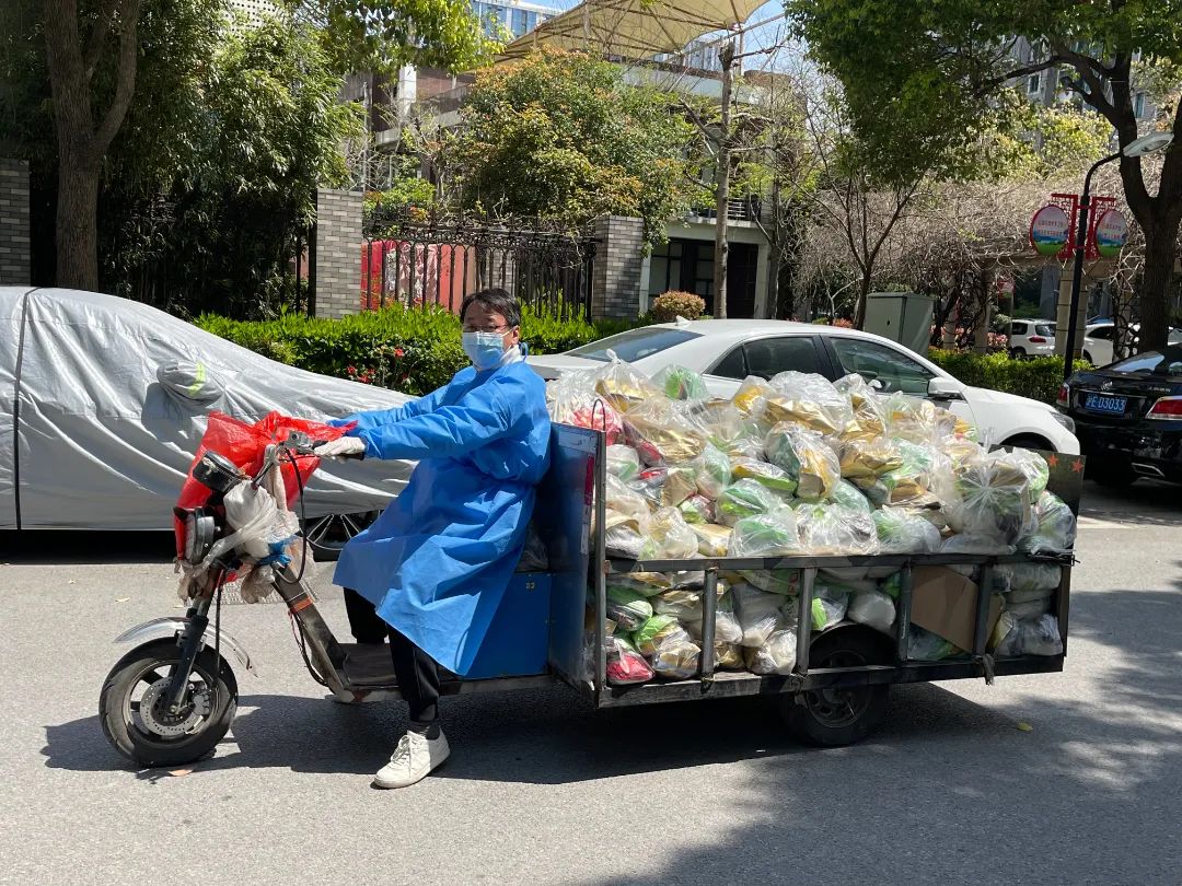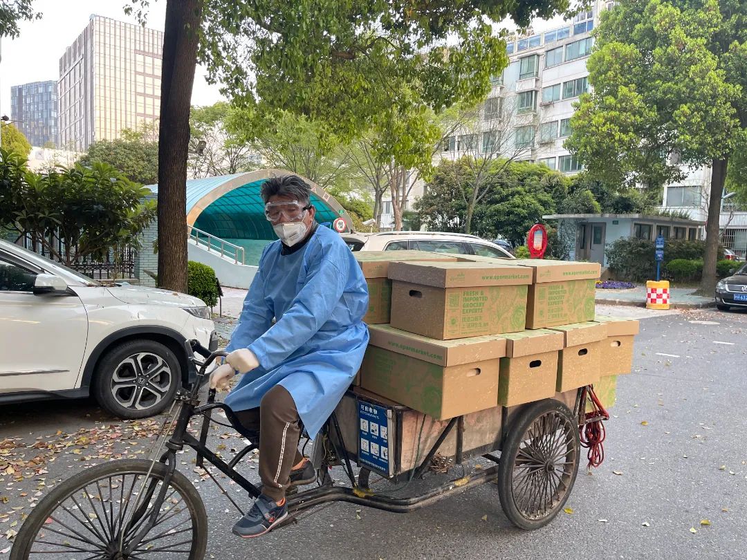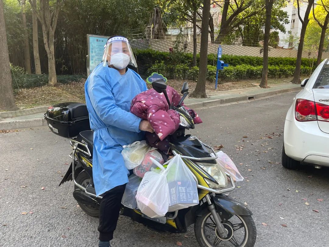 随着物资采购增多,如何快速送达,志愿者群策群力。平板车、三轮车、电瓶车、自行车、外卖车,能想到的交通工具全部用上,大家更用“一双腿”奔走在小区各个楼层,互相接力、及时送达。