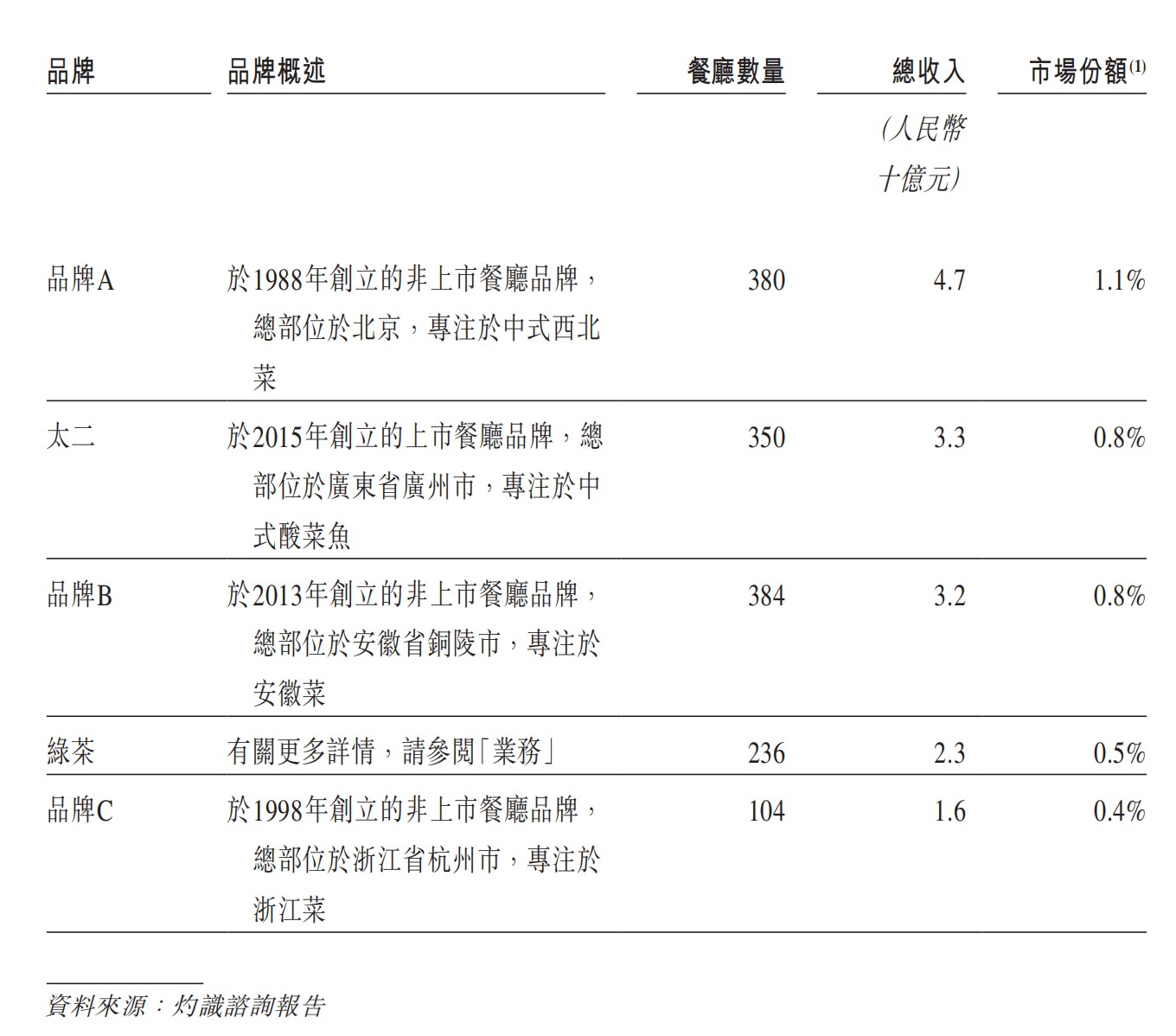 招股书介绍,绿茶餐厅开业第二年就获大众点评“年度最受欢迎餐厅Top50”,此后便开始全国扩张,目前已覆盖所有一线城市。招股书显示,2021年,绿茶集团在休闲中式餐饮市场中占据0.5%的市场份额,位列第四;中式酸菜鱼品牌太二的市场份额则为0.8%,排名第二。