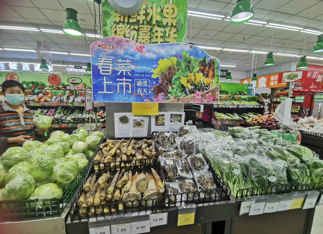12日中午,记者在京客隆甜水园店看到,各类蔬菜水果摆放得满满当当。莴笋2.59元/斤,圆白菜2.38元/斤,黄瓜2.99元/斤,菜花3.69元/斤……店里每天都会推出十几种促销菜品,比平时价位更低。超市里还有不少来自南方的春菜,比如香椿,这几天价格也有所回落,7.5元就能买一盒。