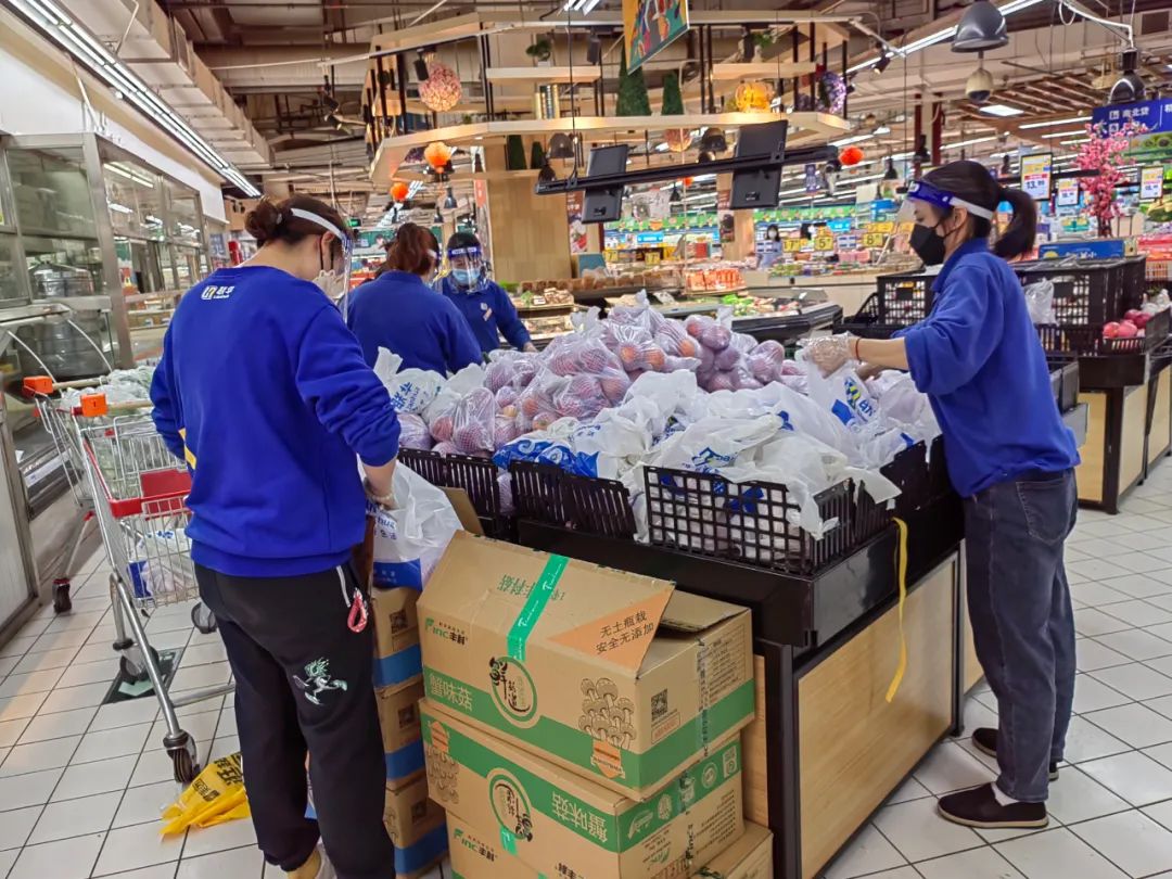 苹果、花菜、鲜肉、莴笋、黄瓜、鸡蛋……戴着口罩和面屏的工作人员在生鲜区分组、有序地进行分拣工作。鲜肉区的师傅在卖力剁肉,“剁肉是一件费时费力的工作,我们两个师傅轮班进行,尽力满足居民的需求。”