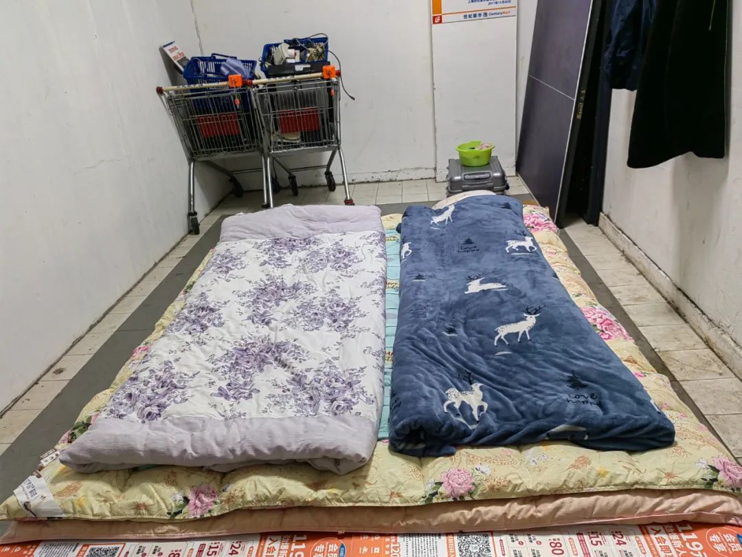 在门店的办公区域,记者看到一个小房间里,几块货板铺在水泥地上,再盖上垫被棉被成为床,可以睡两个人。“卖场收银办公室、闲置的储物间留给女员工,现在,对大家来说,能休息、睡觉就是最大的享受。”郦斌说。