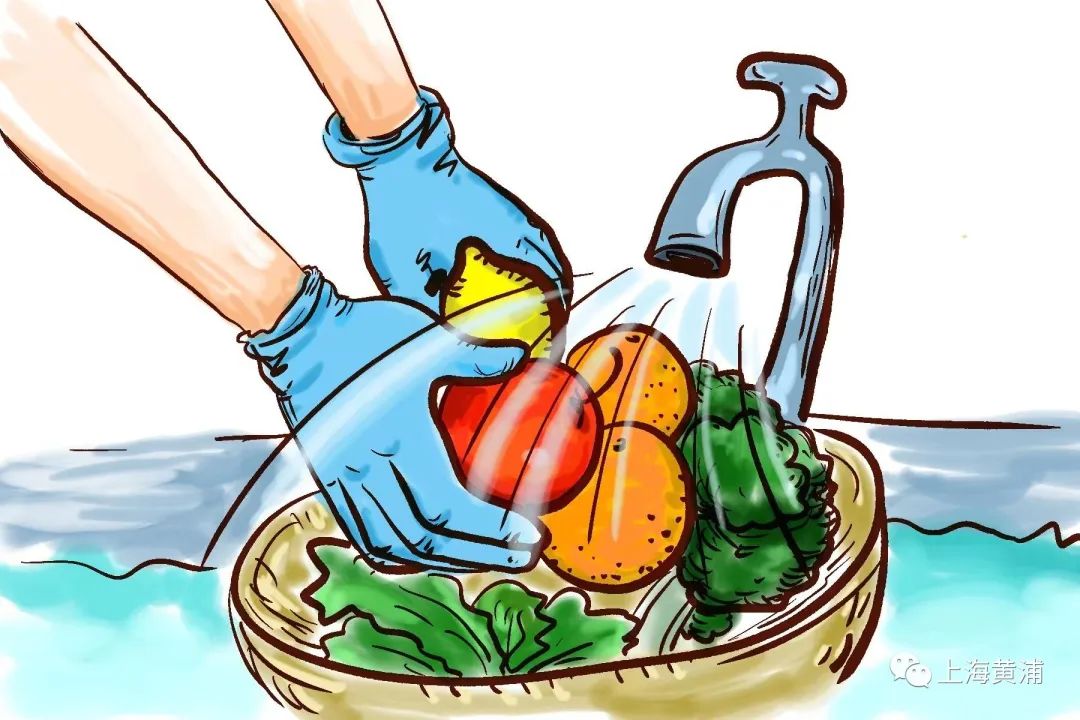 蔬菜、水果等生鲜食品,可佩戴好口罩后,使用慢速水流冲洗或浸泡清洗,擦干、沥干。