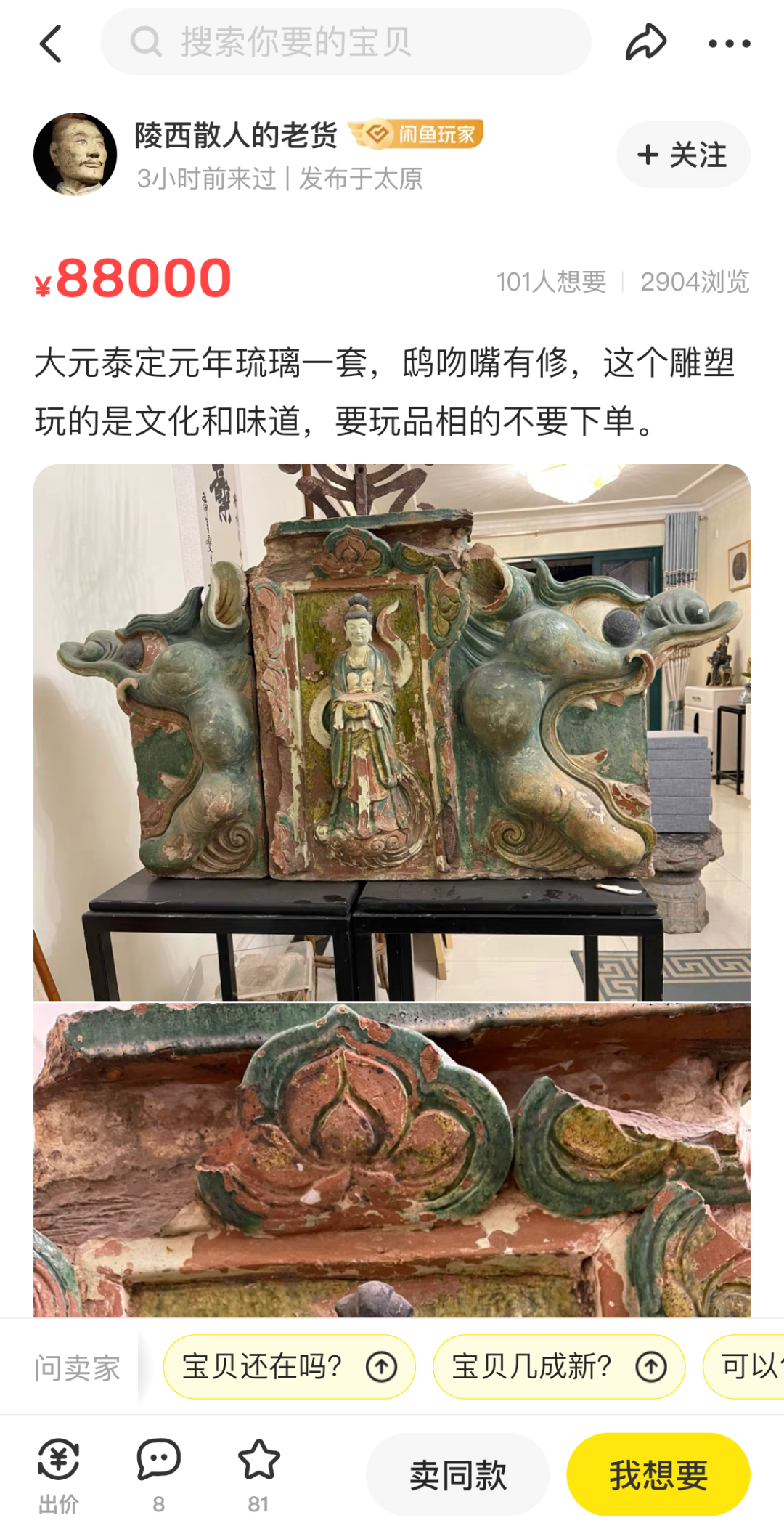 闲鱼上出售的一件琉璃脊饰,
