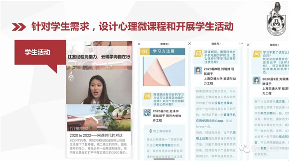 学校开设了“我的心情树洞”信箱,了解学生的学习状态、学习工具、家庭环境、学习环境等内容,动态关注学生学习的变化和心理需求,并基于此开展相应的云端心理活动,如减压沙龙活动等。
