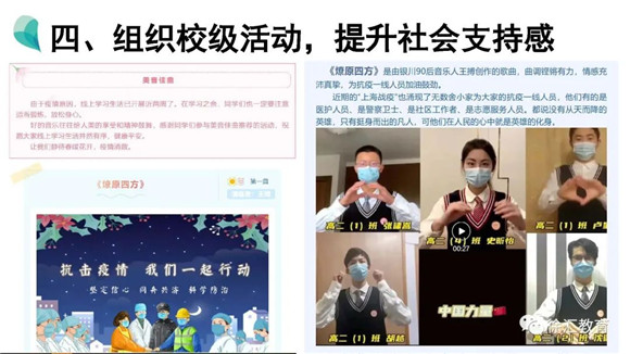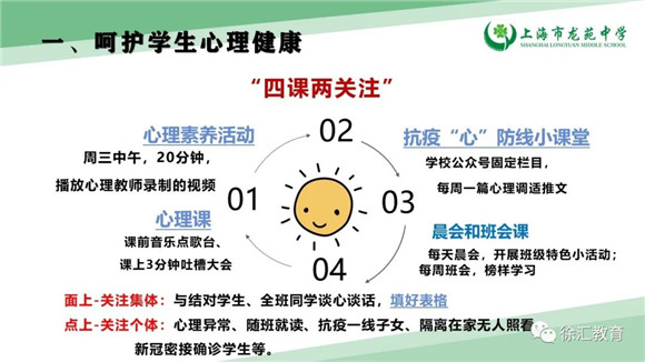 自线上教学以来,各校充分发挥班主任、学生心理联络员、全体导师、家长、学区以及市区网络资源的作用,通过家长会、课堂、仪式、校(班)会、活动等方式,潜移默化地将心理健康教育融合在日常教育教学活动中,高效开展心理健康教育工作。从“心”出发,“育”在云端,我们隔着屏幕传递爱与温暖,期待所有美好都如约而至!