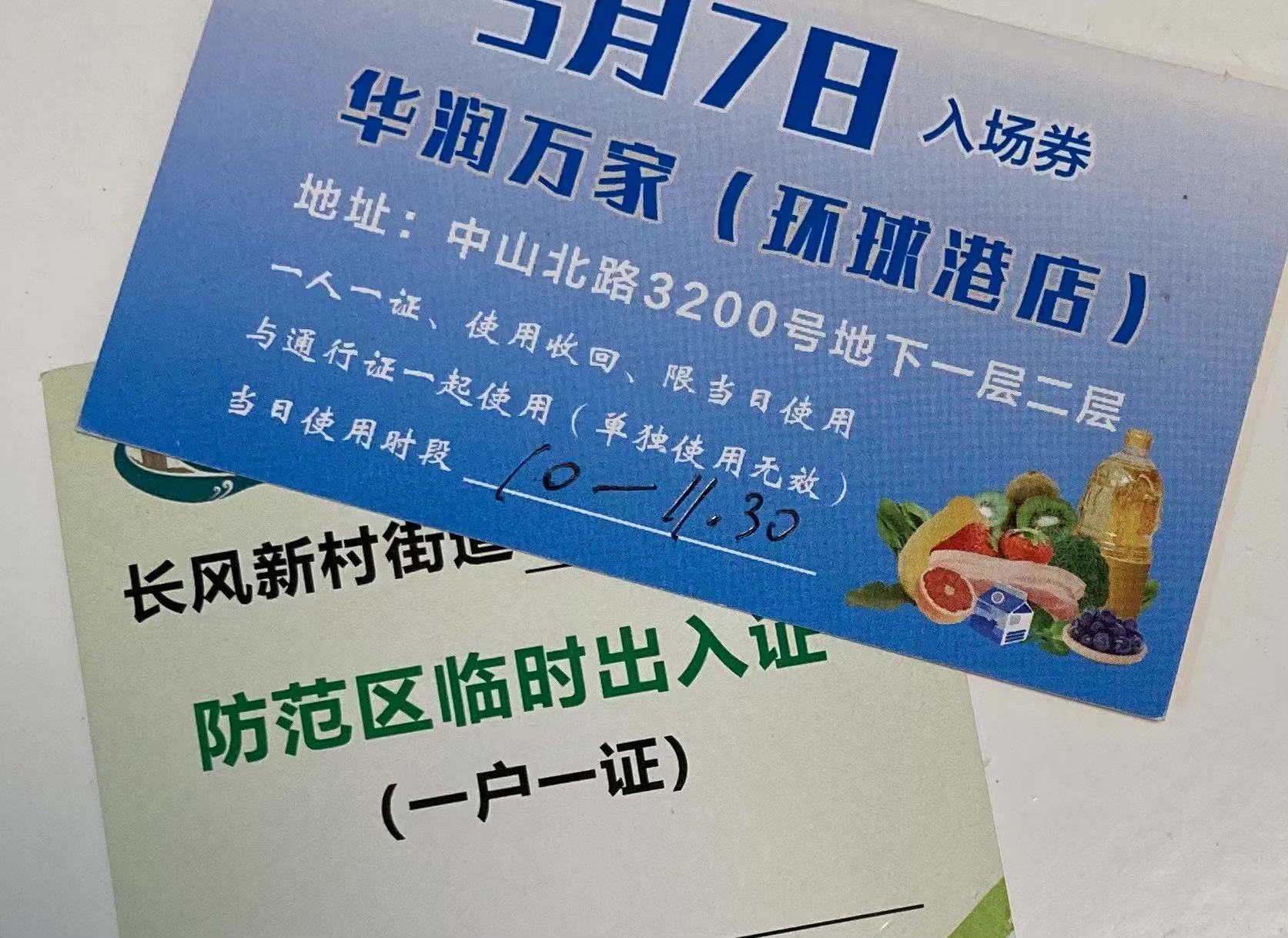 不止出入证,前往商超购物还得加一张“超市邀请卡”。5月3日晚上,可以出门的前夕,志愿者上门为李女士家发放了这几天的出入证以及第二天的家乐福邀请卡——凭邀请卡,可以去一次指定超市,采购生活物资。