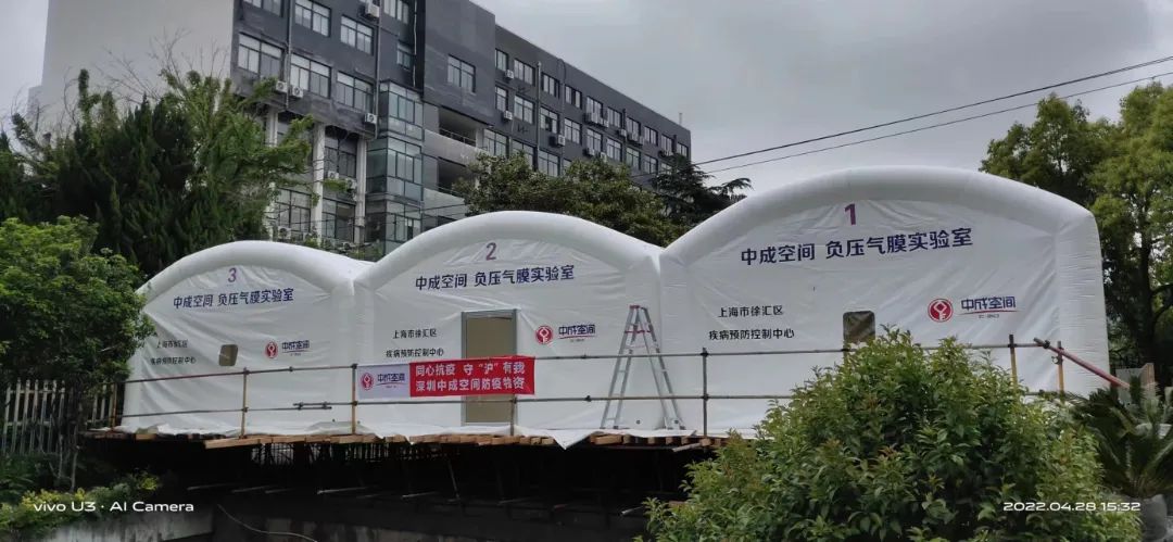 中成空间(深圳)智能技术有限公司捐赠一组移动式负压气膜核酸实验室,帮助徐汇灵活配置高标准核酸检测实验室,提升每日核酸检测能力。